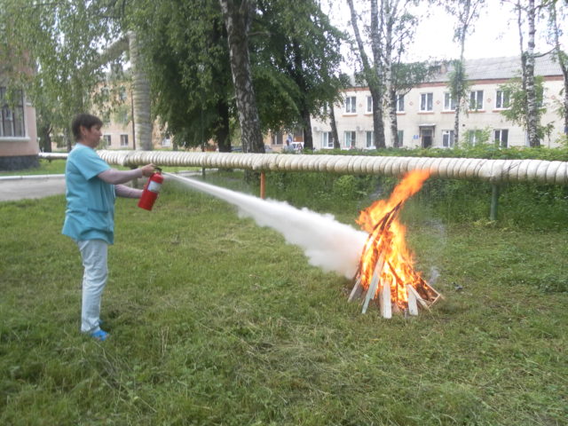 – практичні навчання, тренування по пожежогасінню на території ЦРЛ із використанням первинних засобів пожежогасіння (вогнегасників, кошми) та ін. засобів – піском, водою.